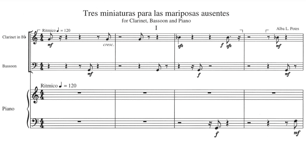 Continuando con la serie de posts dedicados a compositoras de Latinoamérica, quisiera presentarles la estupenda obra “Tres miniaturas para las mariposas ausentes” de la compositora colombiana Alba Lucía Potes, quien reside en los Estados Unidos desde hace ya largo tiempo.