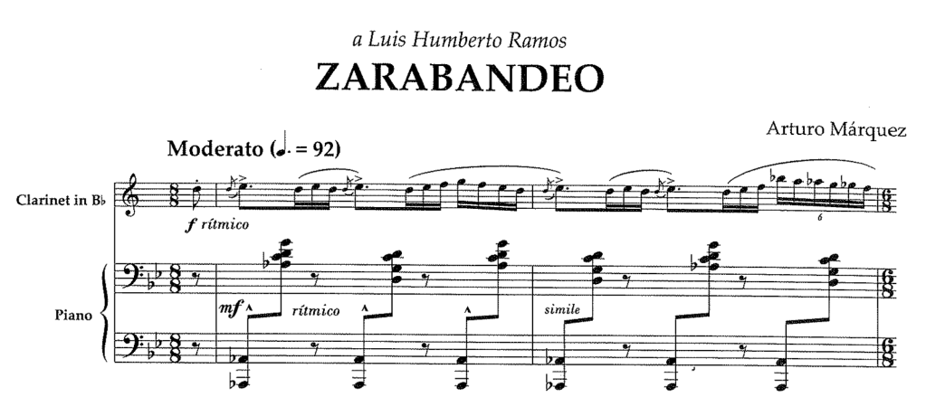 Mientras tanto, en Latinoamérica la zarabanda mantuvo su carácter de danza popular y su poderoso patrón rítmico que subdivide los 8/8 del compás en 3+3+2 dio origen a algunos aires como la milonga en Argentina y el danzón en México y Cuba. En Zarabandeo, Márquez elaboró y alternó estos dos ritmos en un marco de virtuosismo lleno de energía y lirismo, empleando los recursos técnicos y expresivos de ambos instrumentos de manera magistral.